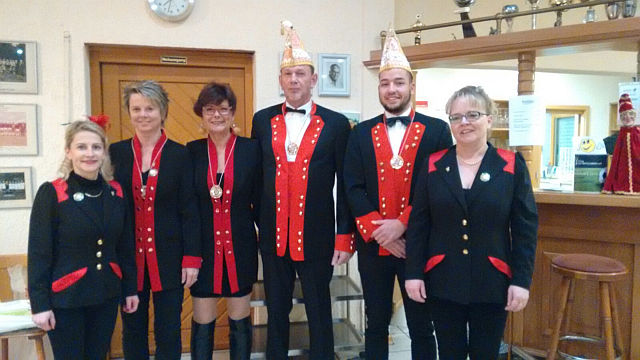 Das Prinzenpaar Prinzessin Ines I. und Prinz Christian II. wurden von den Sitzungspräsidentinen Nicola und Sabine sowie einigen Elferräten, der Roten Garde, und vom Showtanz begleitet.