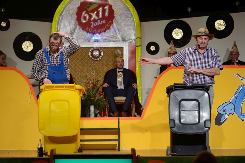 Pünktlich um 19:11 Uhr startete die aktive Narrenschar der KG Hameckia e. V. in die schön, im 60er Jahre- Style, dekorierte Schlosshalle. Gefeiert wurde 6x11 Jahre Hamecker Fasenacht. Alles stand unter dem Motto: “Mir lossen’s krache, durch die 60er, mit de Hamecker Narre”.