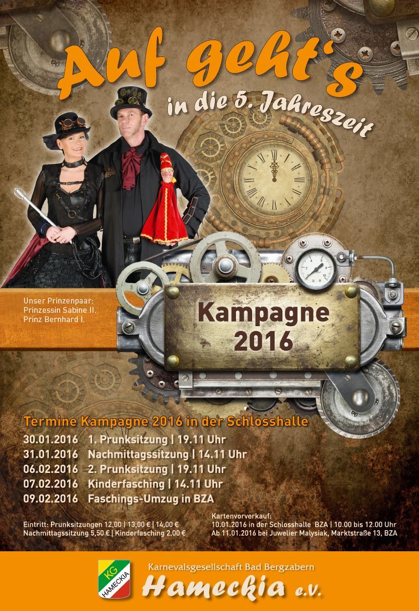 Nach einer weiteren, tollen Tanzrunde wurden den beiden Sitzungspräsidenten klar, dass der Neuen Kampagne der Hamecker jetzt ein Erwachsenes Prinzenpaar fehlt. Nachdem sich im Publikum niemand bereit erklärt hatte, tat sich auf der Bühne eine Schattenwand auf, welches ein Paar verbarg. Diese zogen sich hektisch um und machten sich für Ihren großen Auftritt fertig. Nach großem hin und her, der beiden wurde die Schattenwand entfernt. Es war klar, die KG Hameckia hat ein neues Prinzenpaar. Die extrem kurze Kampagne der Hamecker Fasenacht wird regiert von unserem Prinzenpaar, Prinz Bernhard I. (Schmitt) und Prinzessin Sabine II. (Schmitt- Gilke).Es folgte, unter großem Jubel und Beifall die Insignienübergabe. Die beiden sprachen zu Ihrem jubelndem Publikum. Darauf folgte die erste Ordensverleihung und die Vorstellung des neuen Thema's "In 80 Tagen durch die Fasenacht". Das Thema wurde durch, Marc Hilsinger ins Leben gerufen, dieser hat auch den wunderschönen Jahresorden entworfen.