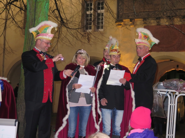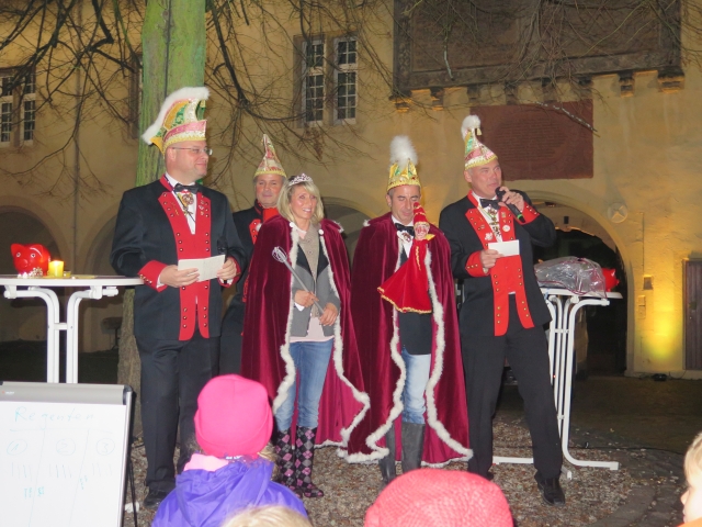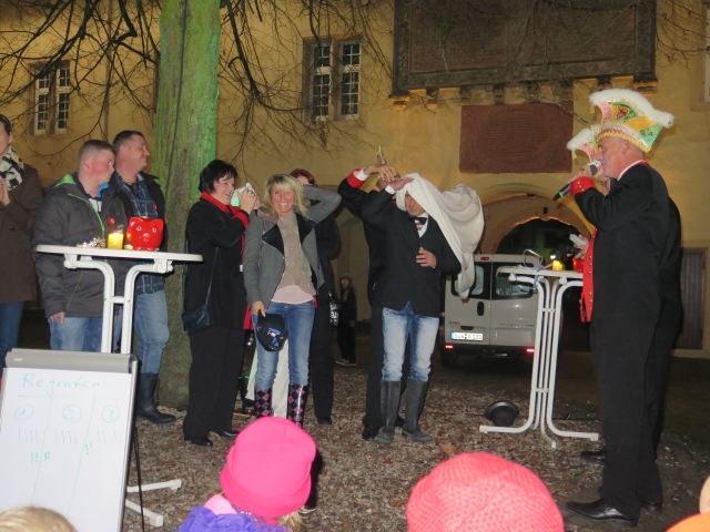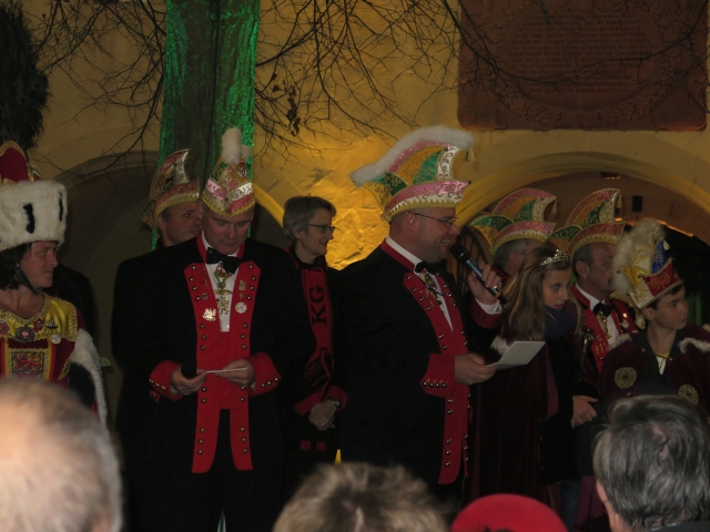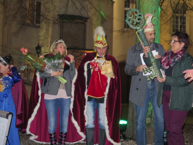 Mit schallendem Jubel und Beifall wurden Sie mit den Machtinsignien der Tollitäten ausgestattet, bevor sie auch schon ihre erste Amtshandlung absolvieren mussten. Prinz Andreas IV. gab den Befehl frei, das Schloss zu stürmen und die Stadtspitze zu entmachten. Die Beigeordneten Martin Wichmann und Monika Scheder übergaben fast Kampflos den Stadtschlüssel und das Schatzkässel, denn es fiel ihnen nicht allzu schwer, da sie ja selbst in der KG Hameckia fleißig mitwirkten.