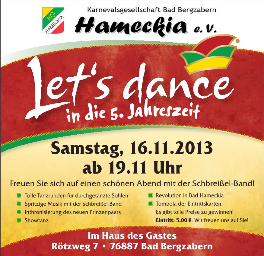Unter dem Motto „Lets Dance“ tanzte die KG Hameckia am 16.11.13 im Haus des Gastes mit seinen Gästen in die närrische Karnevalszeit. Mit einem kleinen bunten Abendprogramm gestalteten unsere Sitzungspräsidenten Dirk Nerding und Jürgen Frenzel die traditionelle Inthronisierung der Prinzenpaare.