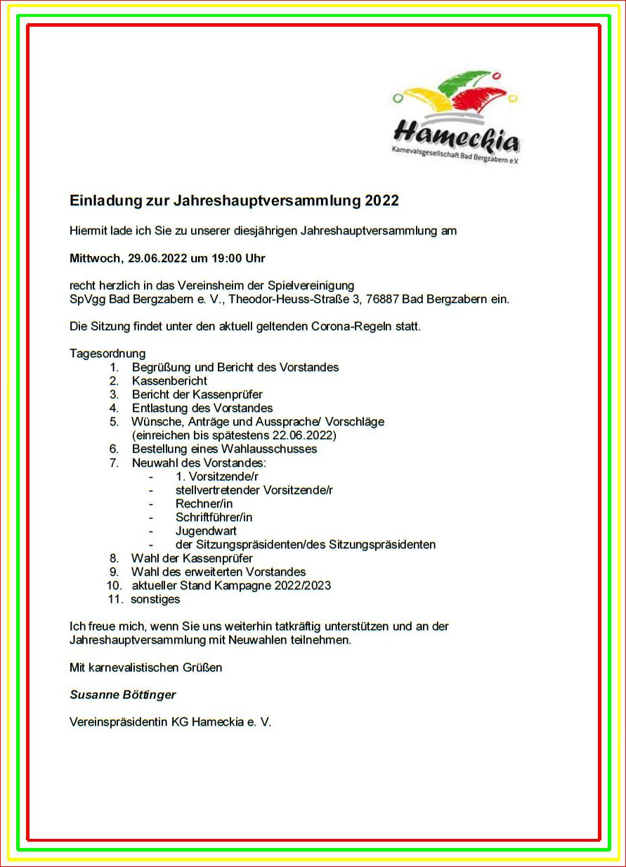 Am 29. Juni 2022 hat die KG Hameckia e. V. ihre Jahreshauptversammlung mit Neuwahlen im Vereinsheim der Spielvereinigung Bad Bergzabern abgehalten.
