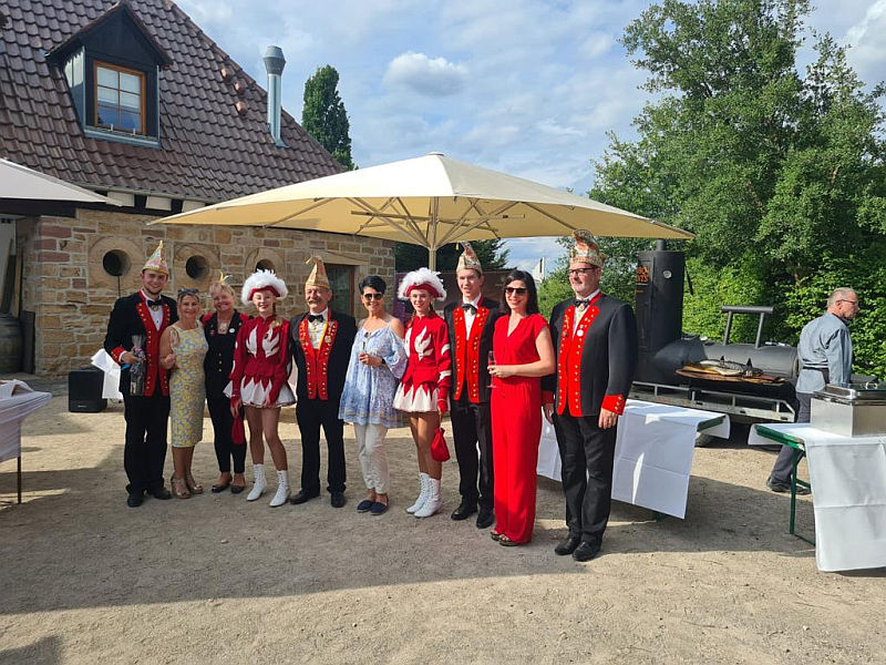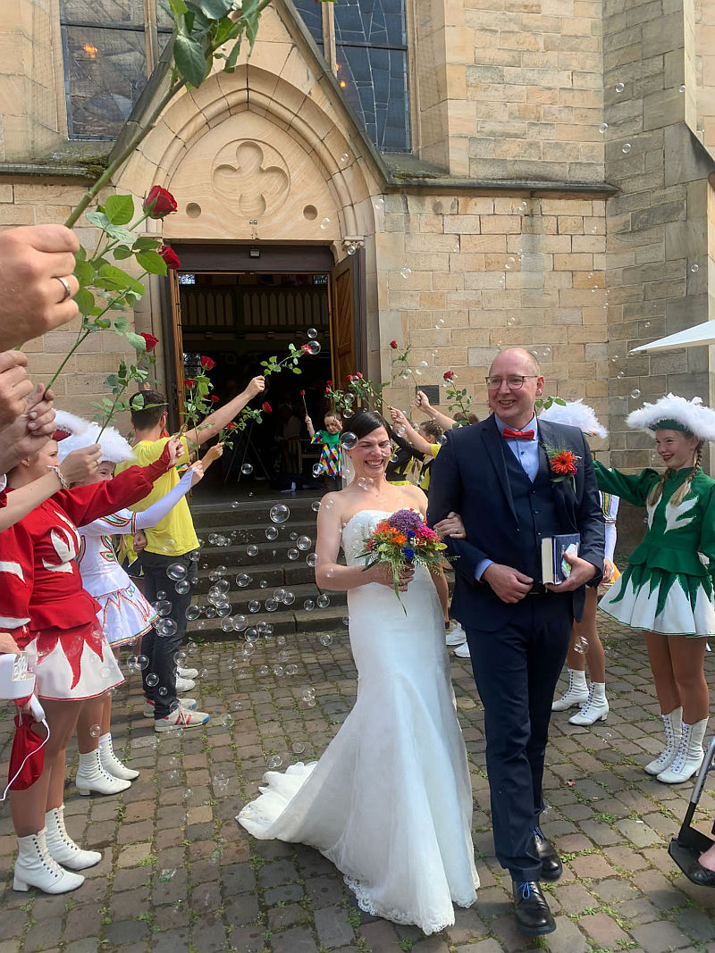Begeistert und sehr gerührt zeigte sich am 12.06.2022 das Brautpaar Susanne und Sven Böttinger, als sie nach der kirchlichen Trauung vom Prinzenpaar, Elferräten und Aktiven aller Hamecker Tanzgruppen empfangen und gefeiert wurden. Susanne Böttinger trainierte und tanzte selbst lange Zeit in Garde und Showtanz, trainiert seit 25 Jahren die Minigarde, war erster Jugendwart im Vorstand und führt den Verein seit 2016 leidenschaftlich als erste Vereinsvorsitzende. Sven Böttinger ist durch seine Susanne zum Verein gekommen. Er ist langjähriger Tänzer und Trainer des Männerballett und unentbehrlicher Helfer beim Bühnenbau. Beide tragen ihrer Zeit als Prinzenpaar den Elferratskittel und wurden für ihre Vereinstätigkeit mit einem großen Flashmob auf dem Marktplatz von den Tanzgruppen beschenkt.