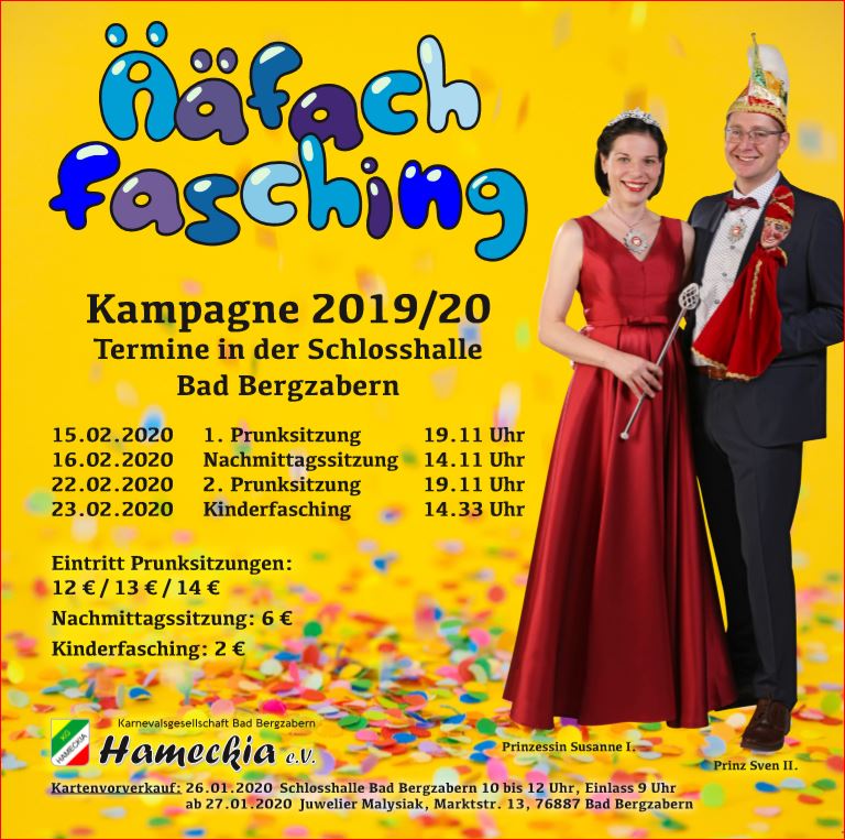 Liebe Hamecker Narren-Freunde, wir laden Sie alle recht herzlich zu unseren Prunksitzungen in der Schlosshalle zu Bad Hameckia ein. Unter dem Motto „Ääfach Fasching“ entführen Sie unsere Akteure, unterhaltsam durch das abwechslungsreiche Programm.