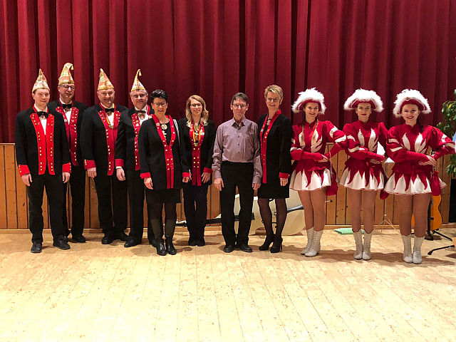 Mit dabei das Kinderprinzenpaar Katharina V. und Finn I. (vorne) sowie die Sitzungspräsidentinnen Nikola Krumholz und Sabine Bentz (rechts).