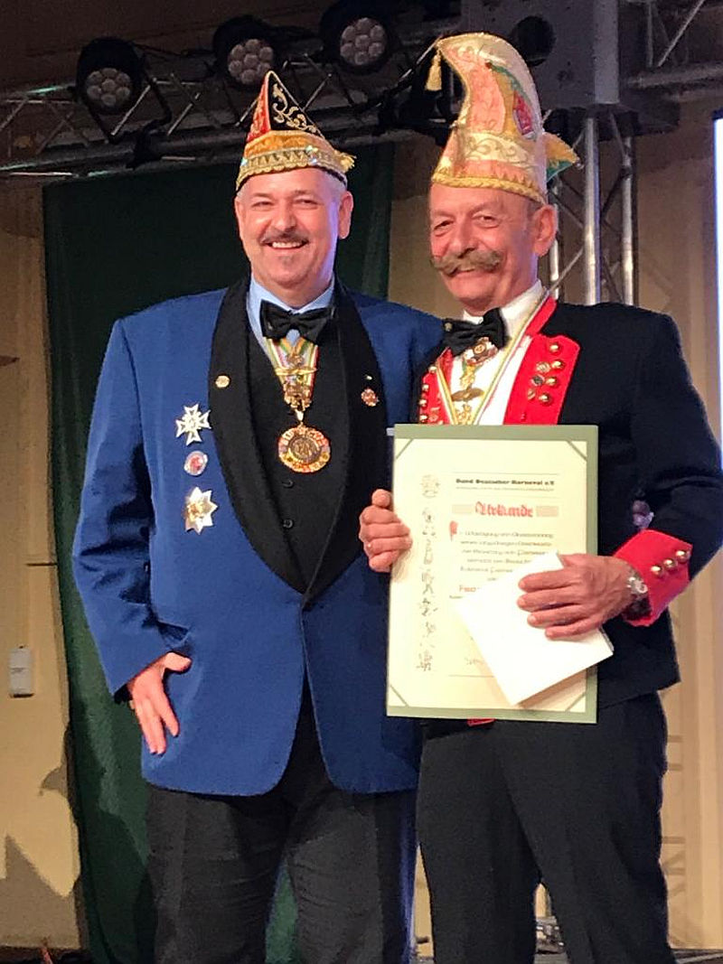 Am Freitag, 15.11.2019 war eine große Abordnung der KG bei der Verleihung des BDK-Orden um drei unserer Mitglieder bei Ihrem großen Tag zu unterstützen. Ausgezeichnet wurden Frank Naumann mit dem BDK-Orden in Gold mit Brillanten für 50 Jahre aktive Mitgliedschaft. Dies ist in unserem Verein bislang die erste Auszeichnung dieser Art. Weiter ausgezeichnet wurden mit dem BDK-Orden in Silber unser Mitglied Christian Albrecht und Martin Wichmann.