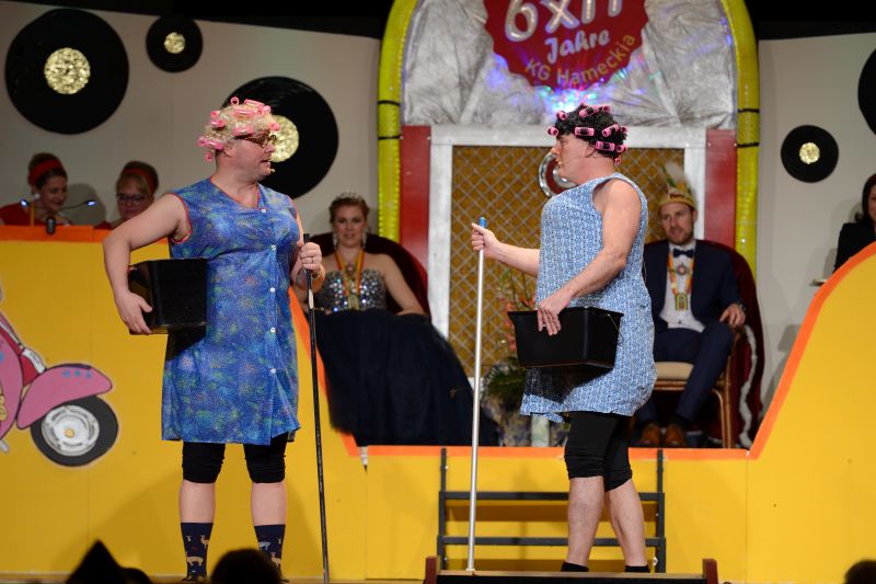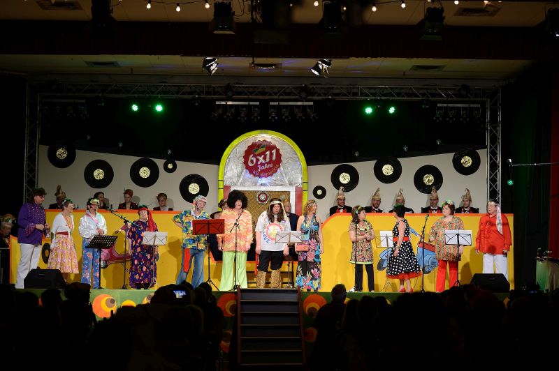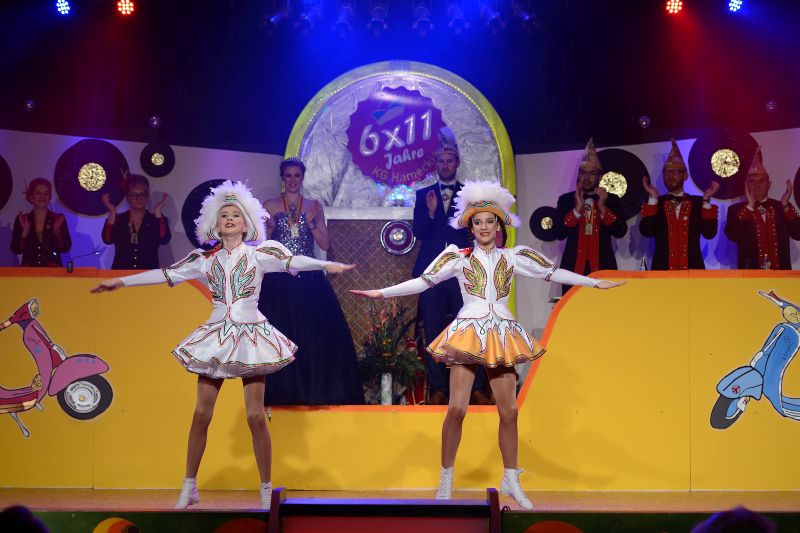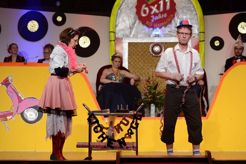 Pünktlich um 19:11 Uhr startete die aktive Narrenschar der KG Hameckia e. V. in die schön, im 60er Jahre- Style, dekorierte Schlosshalle. Gefeiert wurde 6x11 Jahre Hamecker Fasenacht. Alles stand unter dem Motto: “Mir lossen’s krache, durch die 60er, mit de Hamecker Narre”.