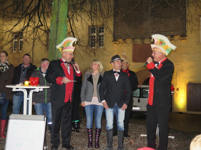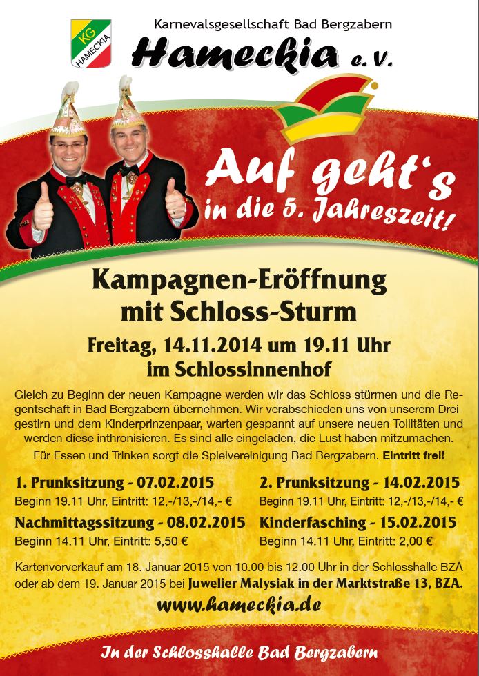 Zum ersten mal im historischen Schlossinnenhof vor zahlreichem Publikum und prominenten Gästen, befreundeten Vereinen des KVE aus Dahn, KVK aus Klingenmünster, den Hutschelhexen und der Spielvereinigung Bad Bergzabern, eröffnete die KG Hameckia die neue Kampagne 2014/15.