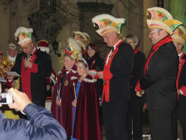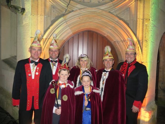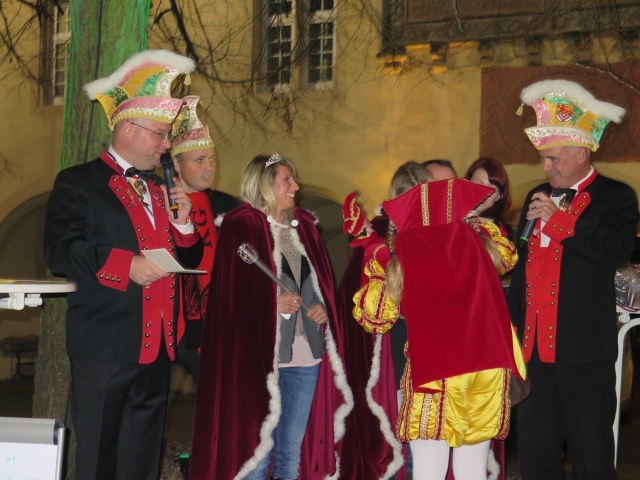 Mit schallendem Jubel und Beifall wurden Sie mit den Machtinsignien der Tollitäten ausgestattet, bevor sie auch schon ihre erste Amtshandlung absolvieren mussten. Prinz Andreas IV. gab den Befehl frei, das Schloss zu stürmen und die Stadtspitze zu entmachten. Die Beigeordneten Martin Wichmann und Monika Scheder übergaben fast Kampflos den Stadtschlüssel und das Schatzkässel, denn es fiel ihnen nicht allzu schwer, da sie ja selbst in der KG Hameckia fleißig mitwirkten.