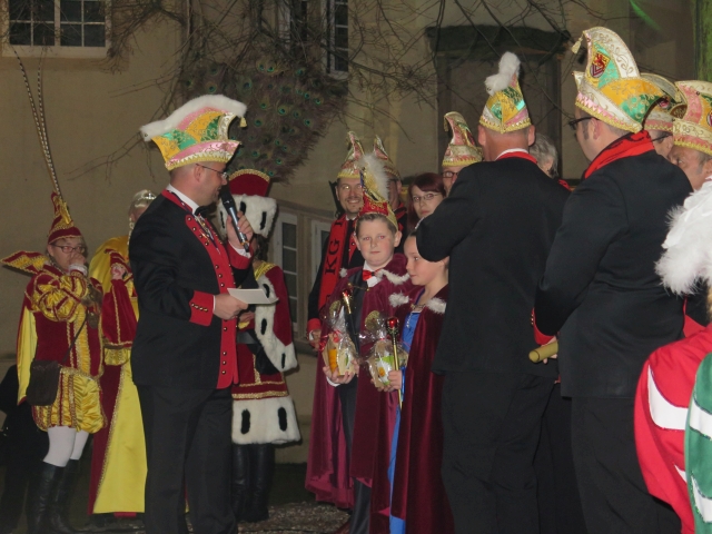 Laut ertönte der Schlachtruf :“BE-ZA“ durch das Gemäuer und die Sitzungspräsidenten Dirk Nerding und Jürgen Frenzel starteten gleich so richtig durch. Das noch amtierende „Dreigestirn, Prinz Sabinus I., JungsfrauStefanie I. und Bauer Siegfried I.“, sowie das Kinderprinzenpaar „Sophie I. & Elias I.“ wurde mit gebührendem Applaus verabschiedet. Im märchenhaften Schlossturm warteten bereits die neuen Kinderhoheiten, Prinz Marcel I. und Prinzessin Jule I., die mit ihrem witzigen und charmanten Auftreten, sich gleich ihren Platz in den Herzen der Narren sicherten.