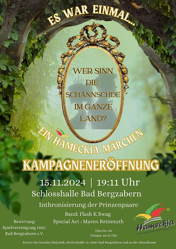 Die fünfte Jahreszeit beginnt! Am 15. November 2024 laden wir zur Eröffnung der neuen Kampagne in die Schlosshalle in Bad Bergzabern ein. Unter dem diesjährigen Motto „Es war einmal… ein Hameckia Märchen“ verspricht der Abend ein unvergessliches Erlebnis zu werden, bei dem Märchen und Karneval zu einem bunten Spektakel verschmelzen.