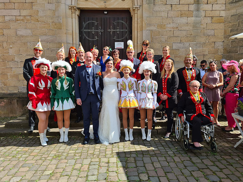 Begeistert und sehr gerührt zeigte sich am 12.06.2022 das Brautpaar Susanne und Sven Böttinger, als sie nach der kirchlichen Trauung vom Prinzenpaar, Elferräten und Aktiven aller Hamecker Tanzgruppen empfangen und gefeiert wurden. Susanne Böttinger trainierte und tanzte selbst lange Zeit in Garde und Showtanz, trainiert seit 25 Jahren die Minigarde, war erster Jugendwart im Vorstand und führt den Verein seit 2016 leidenschaftlich als erste Vereinsvorsitzende. Sven Böttinger ist durch seine Susanne zum Verein gekommen. Er ist langjähriger Tänzer und Trainer des Männerballett und unentbehrlicher Helfer beim Bühnenbau. Beide tragen ihrer Zeit als Prinzenpaar den Elferratskittel und wurden für ihre Vereinstätigkeit mit einem großen Flashmob auf dem Marktplatz von den Tanzgruppen beschenkt.